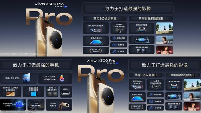 影像是该机的核心卖点:前置为5000万像素摄像头,拥有F2.0光圈和AF自动对焦功能,最高支持4K视频录制。后置5000万蔡司大底主摄+5000万超广角+蔡司2亿APO超级长焦三摄组合,搭配蓝图自研影像双芯和全焦段变焦闪光灯,可以满足用户多样的创作需求。vivo X300 Pro最高支持3.5X光学变焦,内置全新舞台模式、超远距运动抓拍、电影级专业视频和蔡司自然人像等等,对于更专业的用户还可以搭配摄影师套装和长焦增距镜使用。